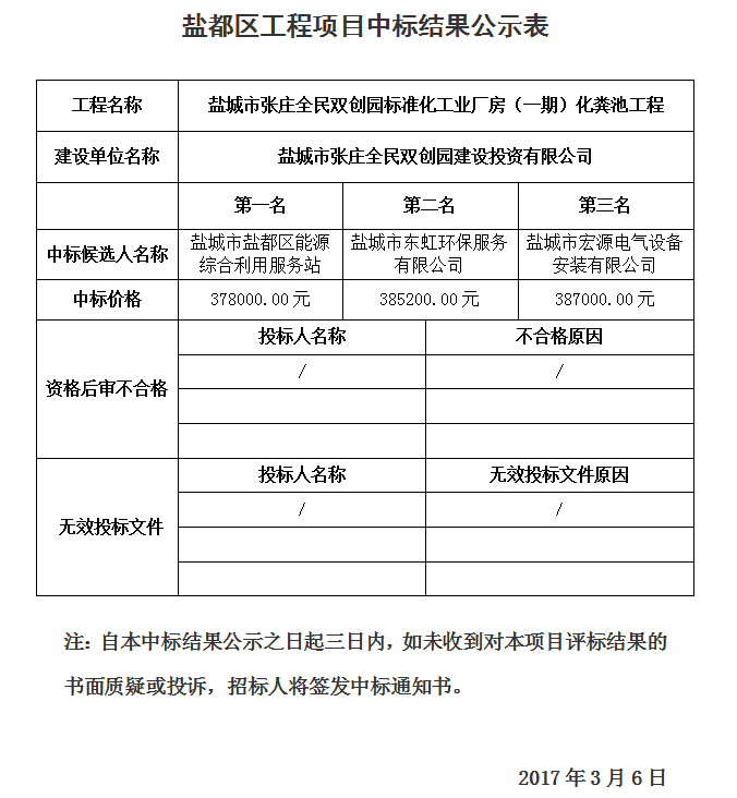 盐城市张庄全民双创园标准化工业厂房(一期)化粪池工程中标结果公示表